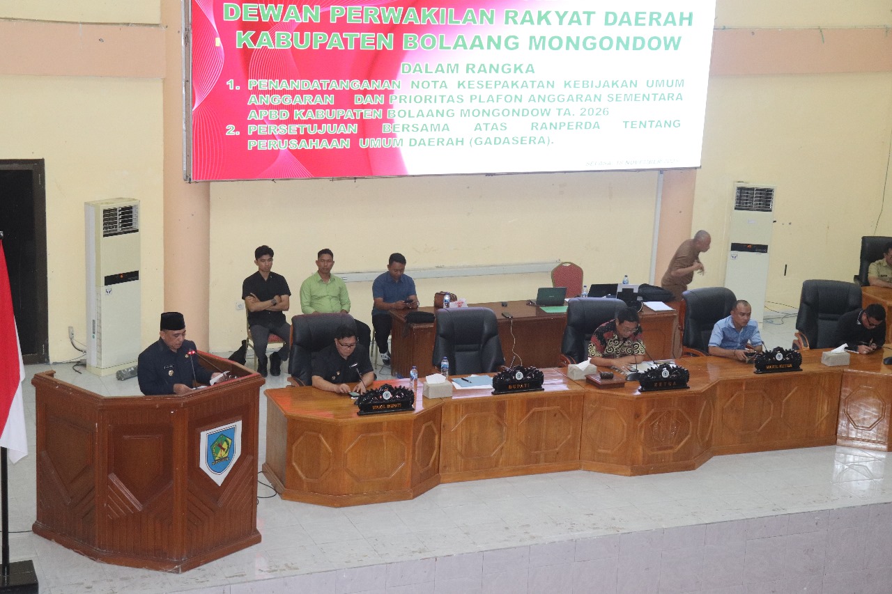 KlikBMR.News Bolmong—Dewan Perwakilan Rakyat Daerah (DPRD) Kabupaten Bolaang Mongondow, menetapkan Rancangan Peraturan Daerah (Ranperda) Perusahaan Daerah (PD) Gadasera, dan melakukan penandatanganan Nota Kesepakatan Kebijakan Umum Anggaran (KUA) dan Prioritas Plafon Anggaran Sementara (PPAS) Anggaran Pendapatan Belanja Daerah (APBD) Tahun 2026, lewat rapat paripurna yang digelar di Gedung DPRD, Selasa 18 November 2025.